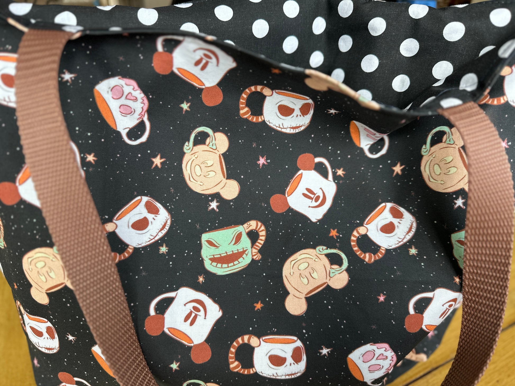 Crafted for the ultimate Disney Halloween lover, this handmade tote is a festive dream come true. Made with custom-printed fabric that showcases iconic Disney character mugs—Jack Skellington, Mickey, Oogie Boogie, and more—this bag captures the fun and nostalgia of Halloween at the parks in every stitch.