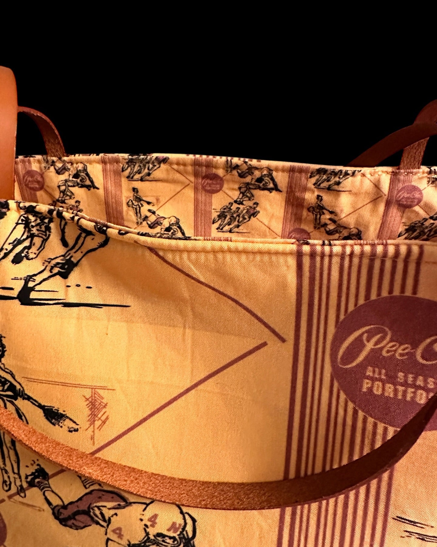 This tote is available for purchase and is entirely handmade, showcasing a unique piece of custom-printed vintage Pee-Chee cotton fabric. The exterior features vibrant, nostalgic designs that mimic the classic folders many of us cherished during our school days. Adding to its charm, the tote is equipped with sturdy leather straps, ensuring both durability and comfort when carrying.