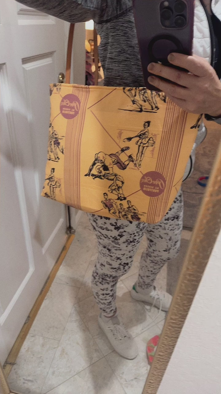 In the accompanying video, you’ll see me holding up the tote to give you a clear sense of its generous dimensions. What’s more, this versatile shoulder bag is reversible! When turned inside out, it reveals a delightful smaller-scale Pee-Chee folder print, adding even more flair to your style options. Whether you’re heading to the beach, running errands, or just looking to make a statement, this tote is designed to meet your needs with a touch of nostalgia. Like with every bag I post, the one in the photos is the bag you’ll be receiving. This is first come first serve, no holds
