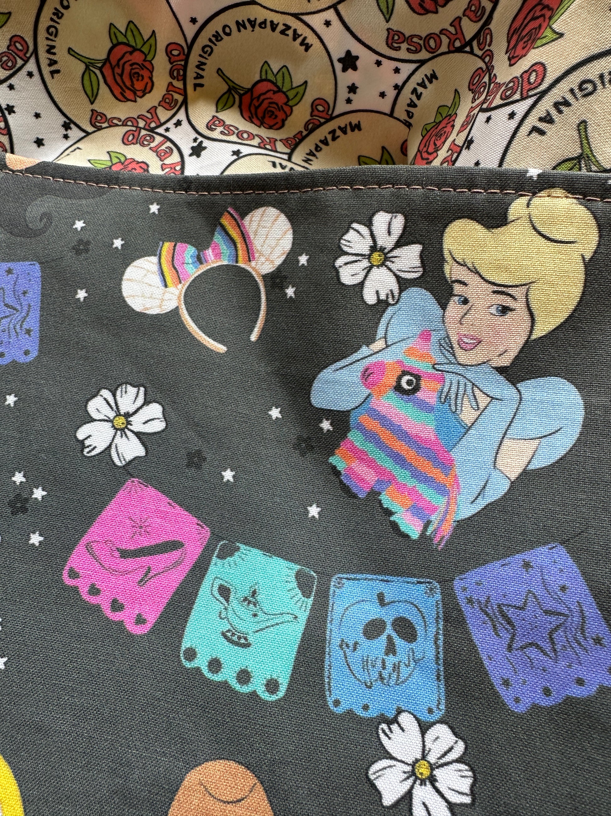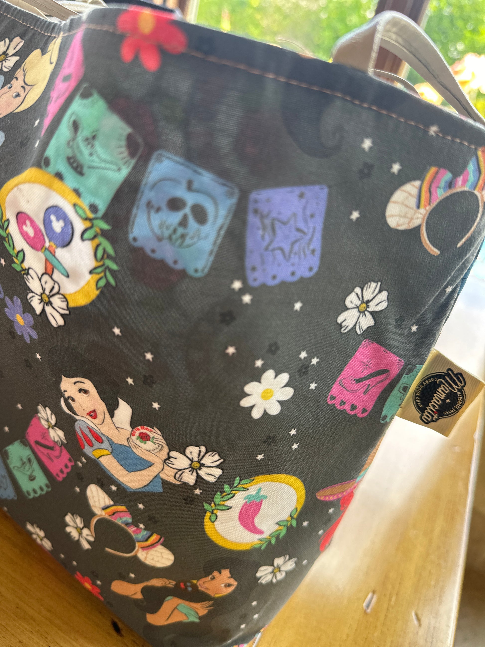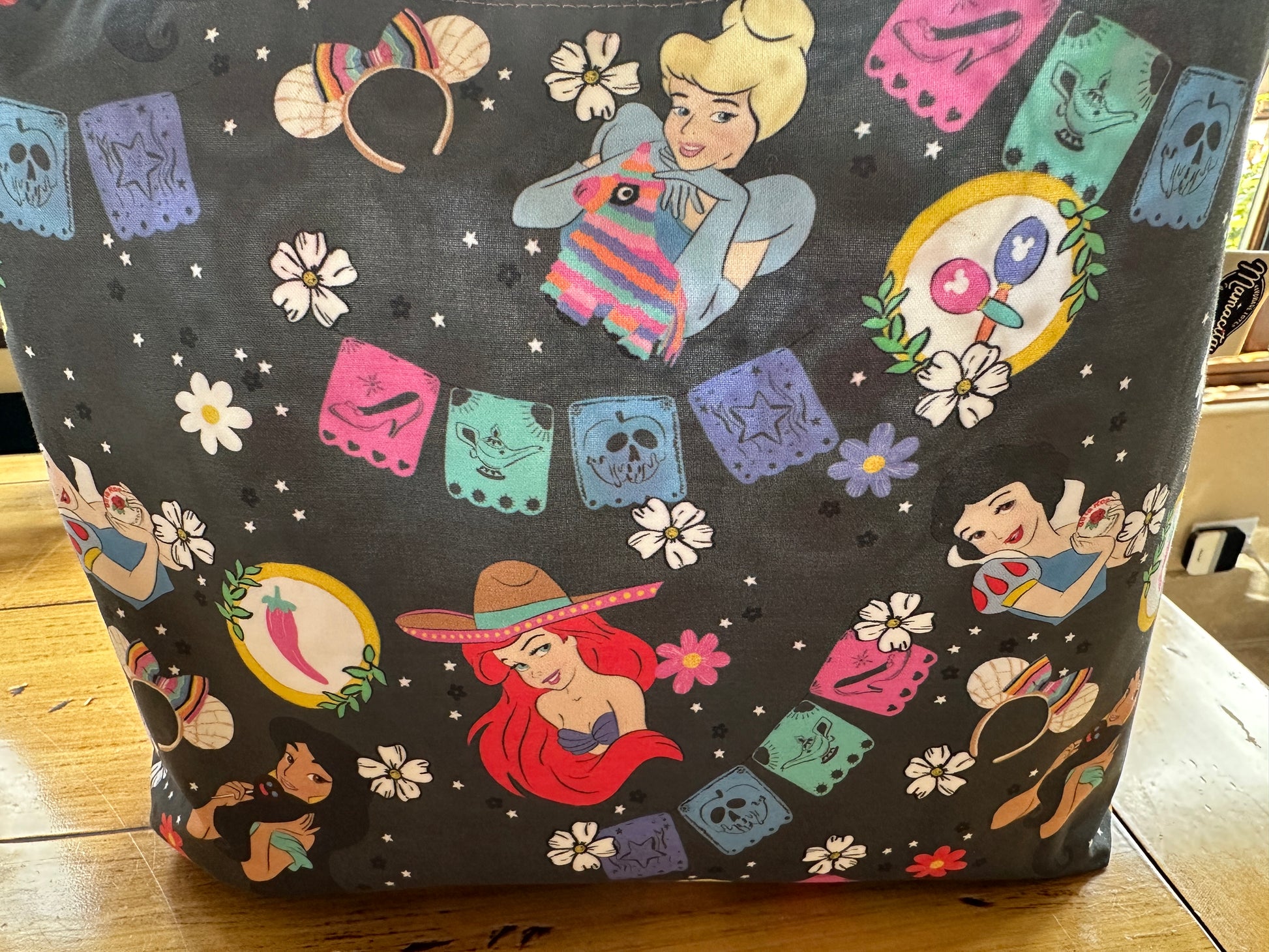 This one-of-a-kind, handmade tote blends magical Disney princess charm with vibrant Mexican flair. On the outside, custom-designed fabric features beloved princesses like Cinderella and Snow White—reimagined with bold cultural accents like colorful piñatas, papel picado banners, pan dulce Minnie ears, and florals under a starlit sky. The vibe? Pure alegrÃa with a hint of nostalgia!