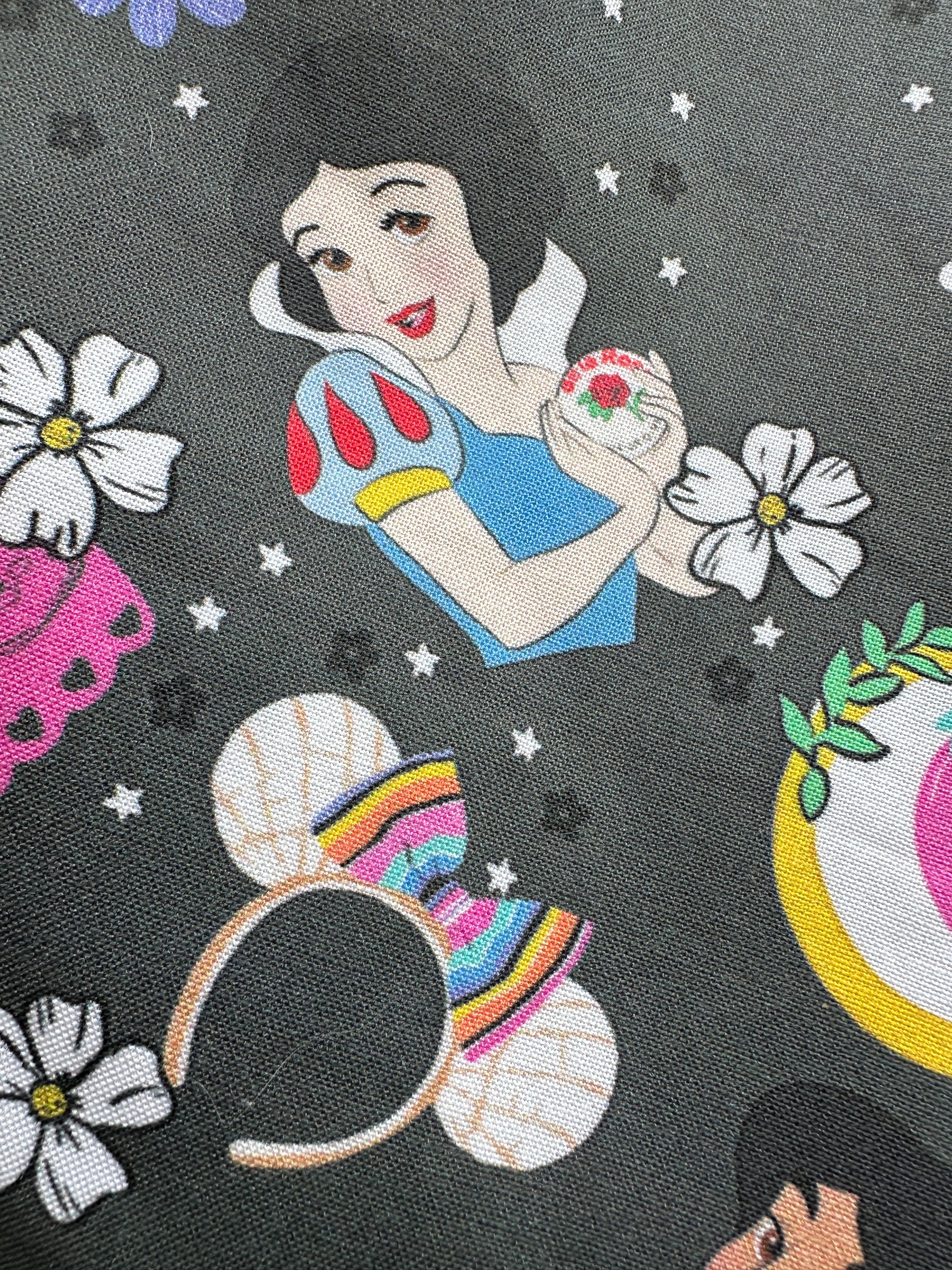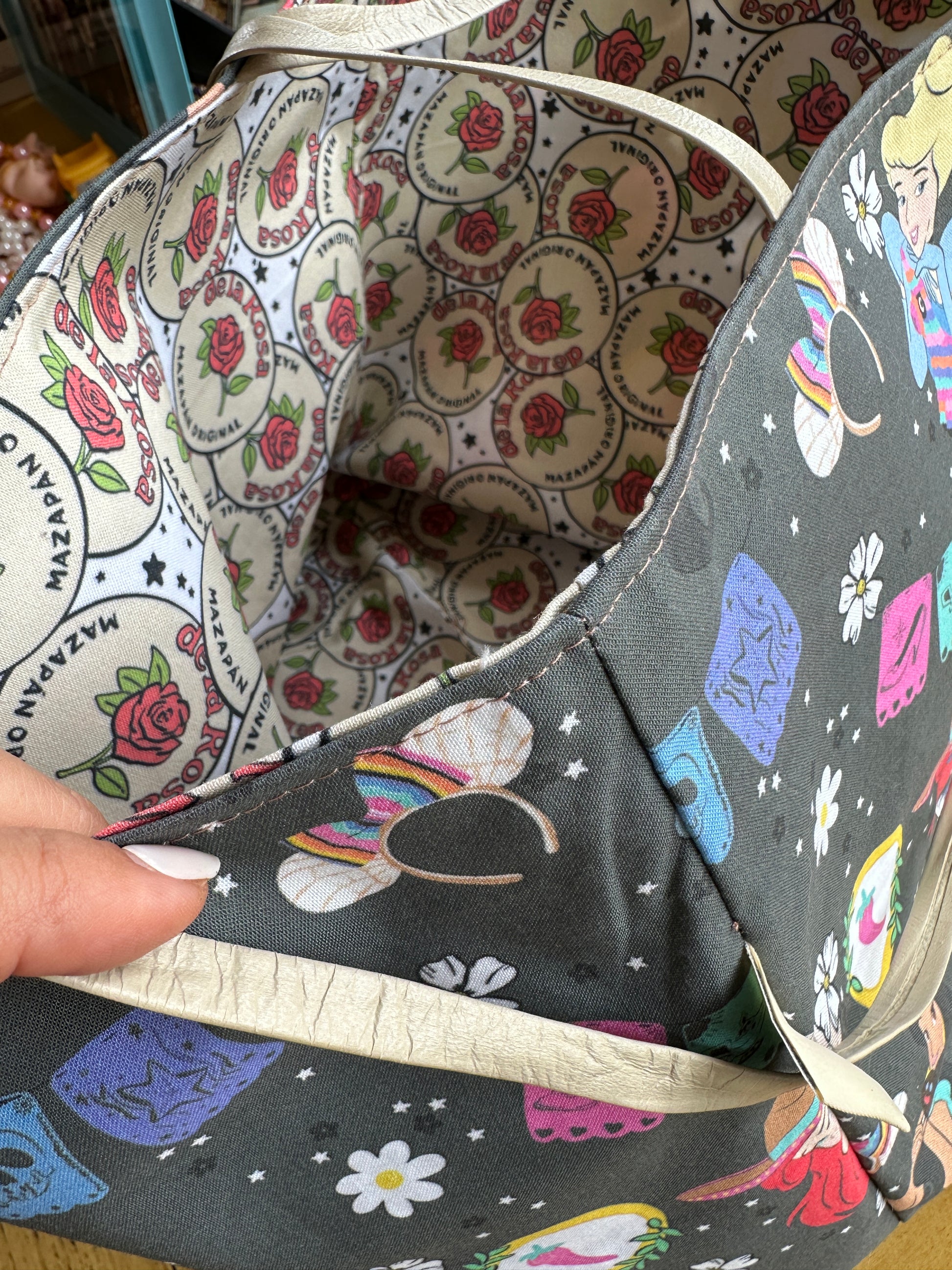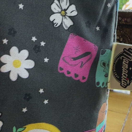 This one-of-a-kind, handmade tote blends magical Disney princess charm with vibrant Mexican flair. On the outside, custom-designed fabric features beloved princesses like Cinderella and Snow White—reimagined with bold cultural accents like colorful piñatas, papel picado banners, pan dulce Minnie ears, and florals under a starlit sky. The vibe? Pure alegrÃa with a hint of nostalgia!